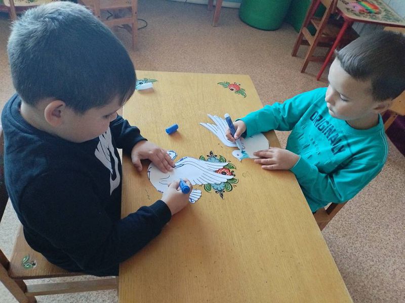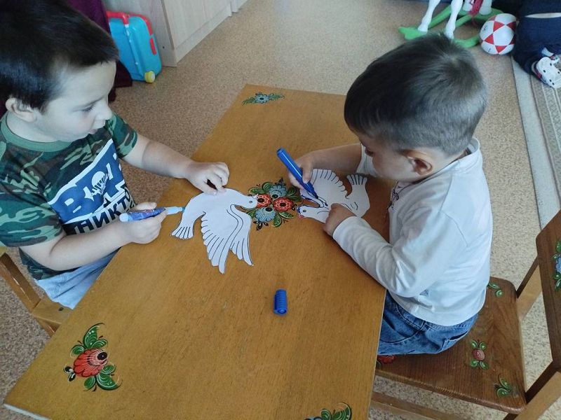 Ребята узнали, что голубь является символом мира и чистоты. Вместе с воспитателем «изготовили» с помощью ладошек, белых голубей, олицетворяющих мир.