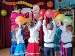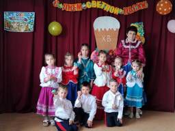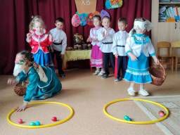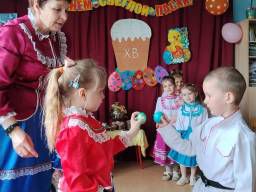 Дети играли в народные игры: катали яйца (у кого дальше прокатится яйцо); раскручивали их (у кого дольше оно прокрутится); а кто быстрее по окончании музыки схватит яйцо – тот будет целый год счастливым.