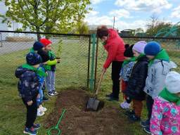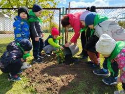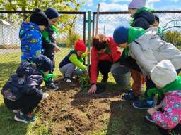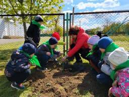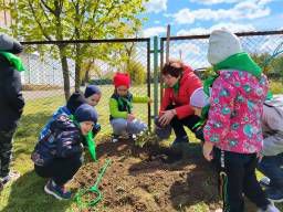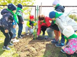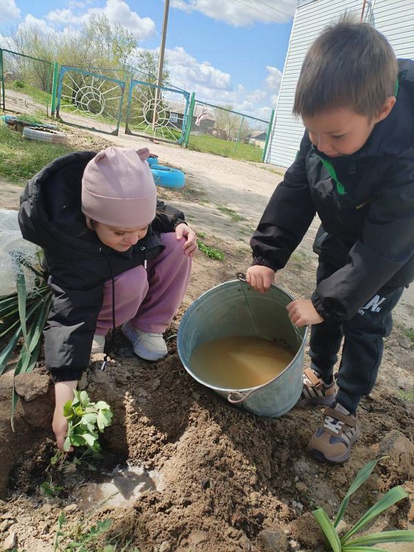 Юные защитники природы охотно приняли участие в посадке деревьев и цветов на участке.На участке посадили березку, подаренную нам бабушкой.