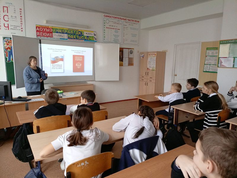На уроке напомнили ребятам о том, что такое Конституция РФ, когда она была принята, что провозглашает. Познакомились со второй главой Конституции нашей страны, которая называется: «Права и свободы человека и гражданина». Ребята узнали о том, что такое права человека, чем они отличаются от обязанностей, и как жить, не нарушая нормы закона.